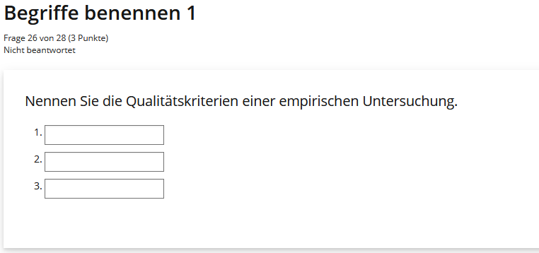 Je größer der Levenshtein-Abstand, desto größer die Toleranz für abweichende Rechtschreibung. Dies kann besonders sinnvoll sein, um die Chancengleichheit für die bestimmte Personengruppen (z.B für die Personen mit Legasthenie ) zu schaffen. - Sie können auch mehr Antwortoptionen angeben, als Begriffe benannt werden müssen (Beispiel: Nennen Sie 5 der 10 Begriffe für...).