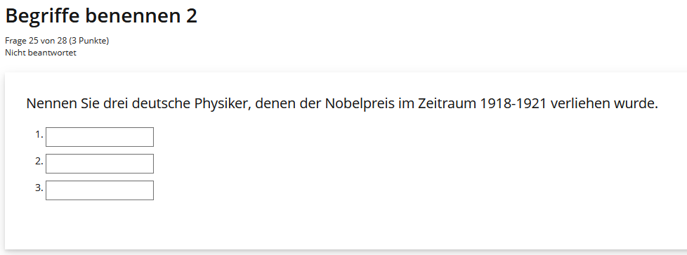 Je größer der Levenshtein-Abstand, desto größer die Toleranz für abweichende Rechtschreibung. Dies kann besonders sinnvoll sein, um die Chancengleichheit für die bestimmte Personengruppen (z.B für die Personen mit Legasthenie ) zu schaffen. - Sie können auch mehr Antwortoptionen angeben, als Begriffe benannt werden müssen (Beispiel: Nennen Sie 5 der 10 Begriffe für...).