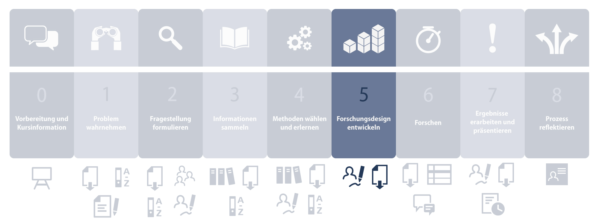 Das Ziel dieser Phase ist es, dass die Studierenden ein Forschungsdesign für die Untersuchung ihrer Fragestellung entwickeln. Dabei sollten Erhebungs- und Auswertungsmethoden, Erhebungszeitpunkte, Stichprobe mit Blick auf die Forschungsfrage definiert und geplant werden.